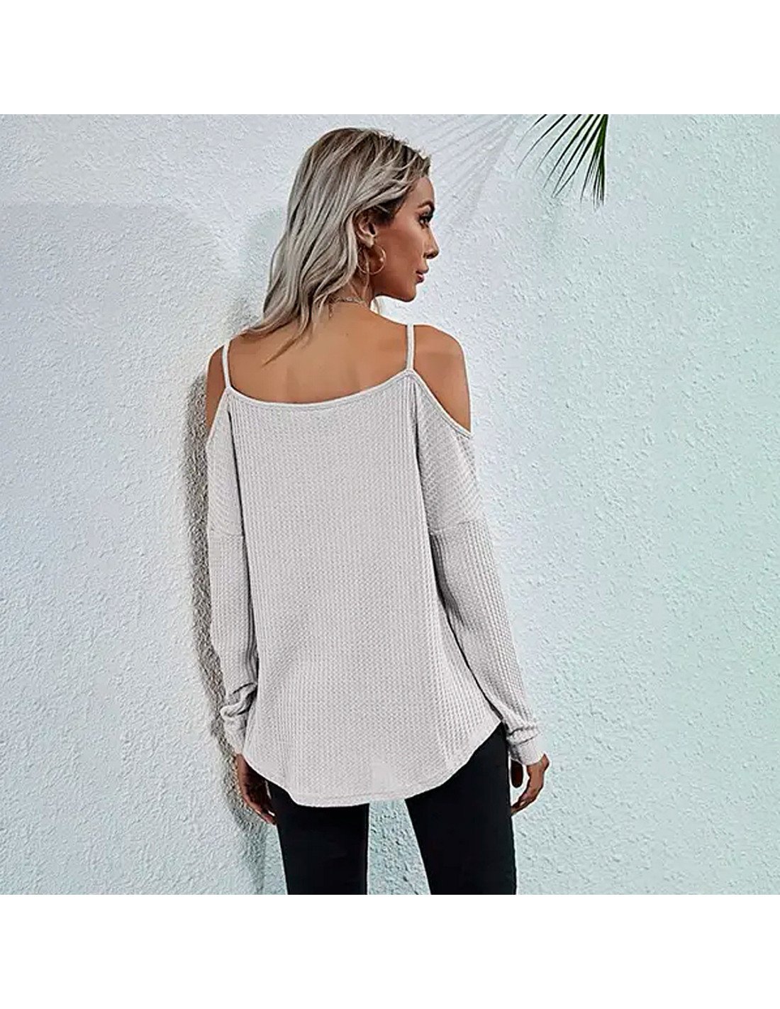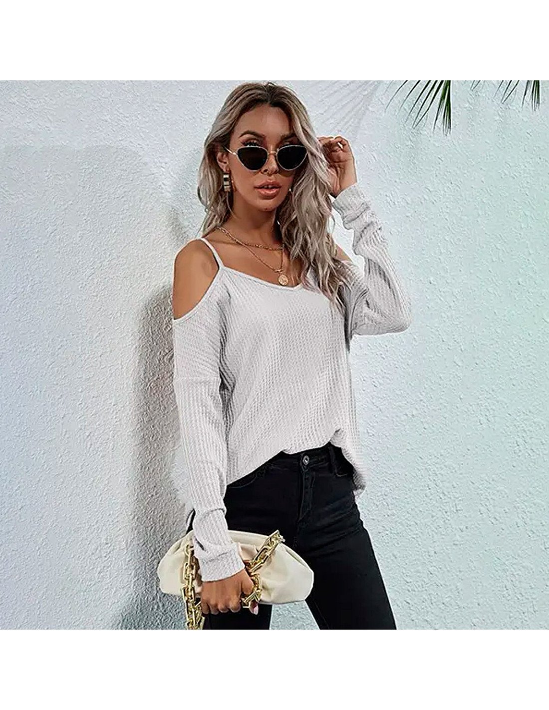 Camiseta con diseño de hombros descubiertos y tirantes delgados. Camiseta tipo suéter, tiene un tejido de textura acanalada y un corte holgado, lo que proporciona un look casual y cómodo. Está combinado con unos jeans, creando un conjunto ideal para un estilo relajado y moderno. |