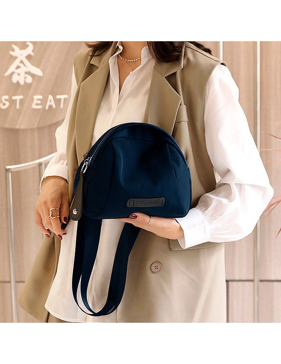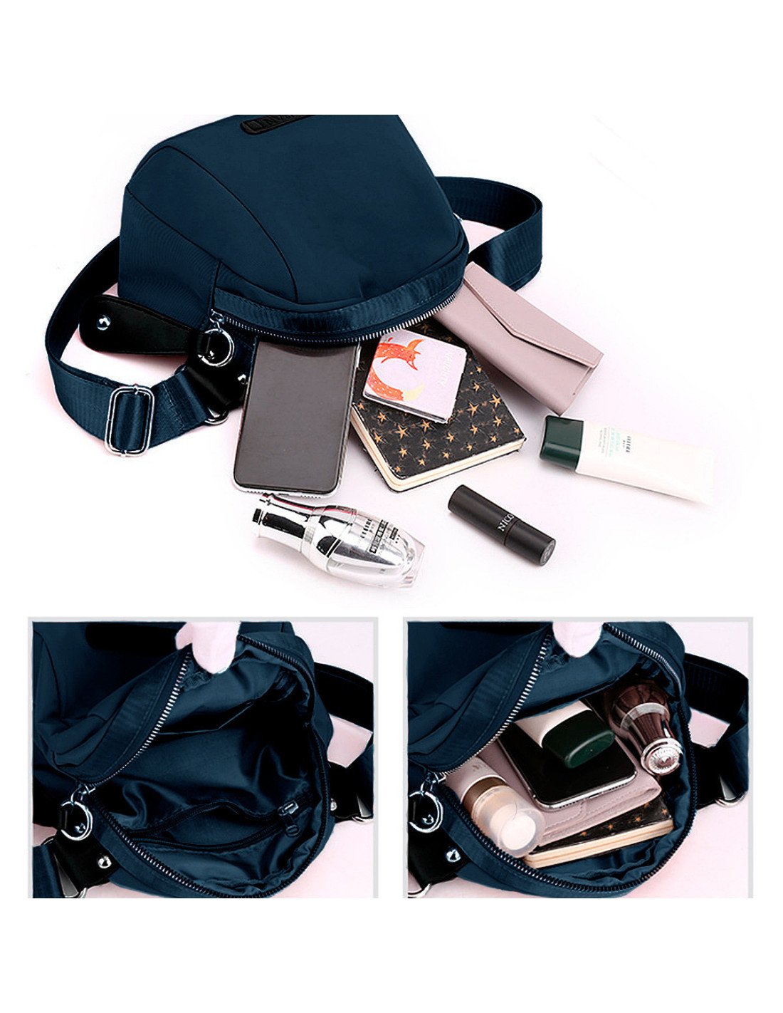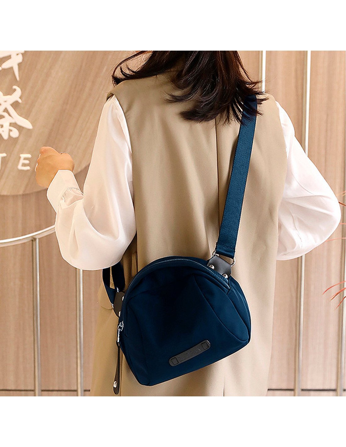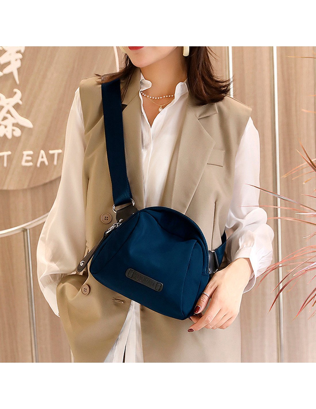 El bolso tiene un diseño compacto y moderno, con una correa ancha ajustable que permite llevarlo cómodamente al hombro, cruzado o tipo cangurera. |