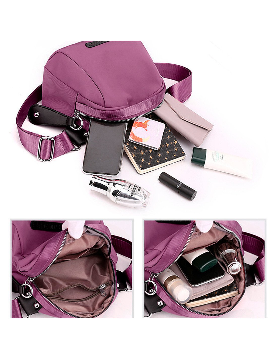 El bolso tiene un diseño compacto y moderno, con una correa ancha ajustable que permite llevarlo cómodamente al hombro, cruzado o tipo cangurera. |