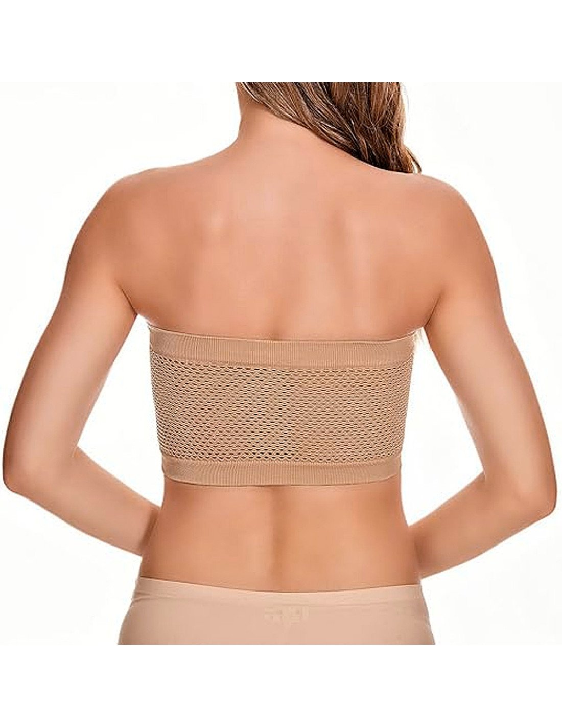 Este diseño sin tirantes es ideal para ser utilizado con prendas de hombros descubiertos o para evitar que se vean las correas del sujetador. El material parece suave y elástico, con una sección de malla en los laterales que proporciona transpirabilidad y confort. Este tipo de sujetador es frecuentemente elegido por su versatilidad y comodidad. |