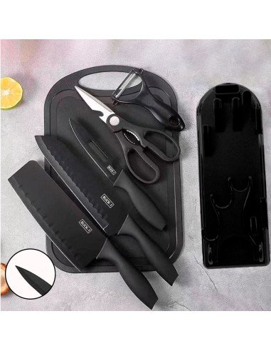 · Fabricados en acero inoxidable Negro: Es resistente a la corrosión y fácil de mantener, ideal para cuchillos de uso diario. Ofrece un borde afilado y sostenido por más tiempo Ideal para cortes precisos y finos · Cuchillo Chef 31.5cm. · Cuchillo de cocinero 29.5cm. · Cuchillo para Fruta 22.9cm. · Tabla de picar · Pelador