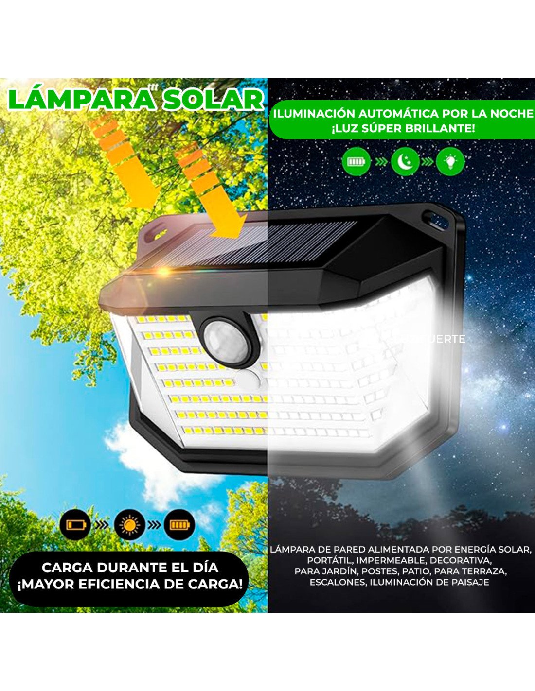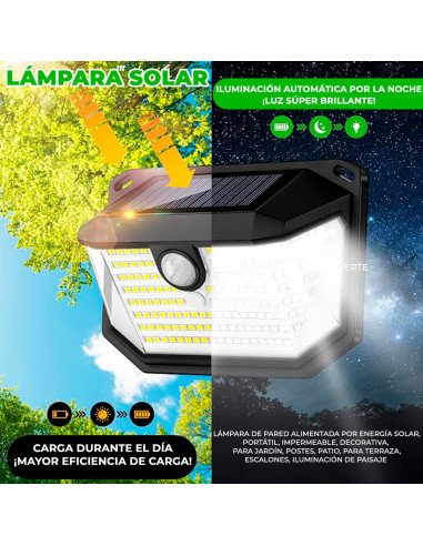 LUCES SOLARES MEJORADAS: Estas luces solares para exteriores están equipadas con una batería recargable integrada que funciona con energía solar, que no requiere ningún costo de electricidad. El tiempo de trabajo continuo puede ser de hasta 8-10 horas por la noche después de estar completamente cargado. (NOTA: Cuanta más luz solar directa reciba, más tiempo duradero por la noche). DETECTOR DE MOVIMIENTO AVANZADO Y 3 MODOS OPCIONALES: Aplicando el detector de movimiento avanzado, estas luces solares para exteriores detectan movimiento de hasta 16 pies con un ángulo de 120 grados. Además, estas luces solares proporcionan 3 modos de iluminación que pueden satisfacer tus diferentes necesidades de luz: 1. Modo de permanencia (se enciende automáticamente por la noche y permanece encendida toda la noche). 2. Modo de luz tenue (se enciende por la noche con luz tenue, 100% de brillo durante 15 segundos cuando se detecta movimiento). 3. Modo de luz fuerte (enciende mientras se detecta movimiento). 178 CHIPS LED SUPERBRILLANTES Y ÁNGULO DE ILUMINACIÓN DE 270° DE ANCHO: Estas luces solares de movimiento vienen con 178 chips LED de alta calidad, en comparación con otras luces solares de cubierta que solo con 120 LED, nuestras luces solares de pared ofrecerán abundante iluminación. El diseño del reflector de luz y el ángulo de iluminación de 270° de ancho traerán más beneficios, alegrarán tu espacio y mejorarán la seguridad de tu hogar. Es una opción perfecta de luz de seguridad. IP65 IMPERMEABLE Y FÁCIL DE INSTALAR: Estas luces solares de pared están hechas de materiales de alta calidad. Son impermeables, a prueba de polvo, resistentes al calor y a las heladas. Estas luces con sensor de movimiento están especialmente diseñadas para soportar condiciones climáticas extremas, resistentes para años de uso. MULTIUSO Y CALIDAD CONFIABLE: Estas luces solares LED para exteriores tienen un diseño fácil de instalar y son portátiles, todos los accesorios e instrucciones necesarios están incluidos, es una luz de movimiento al aire libre perfecta para tu jardín, patio, porche, terraza de pared, valla, puerta delantera, campamento, camino, canaleta, etc. |