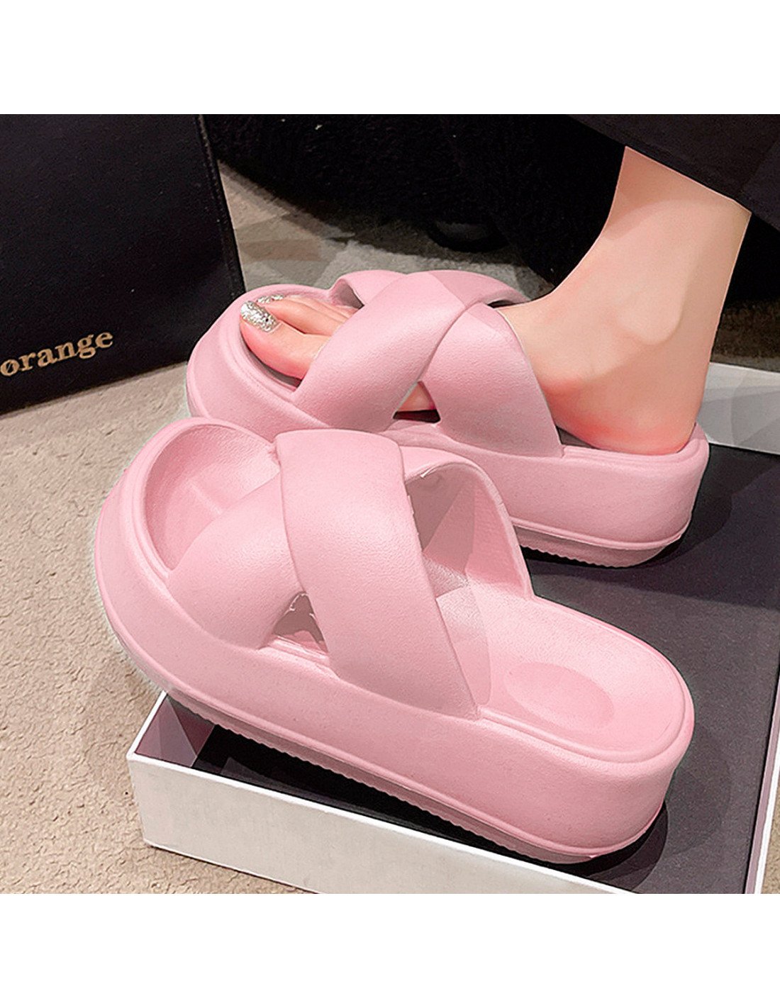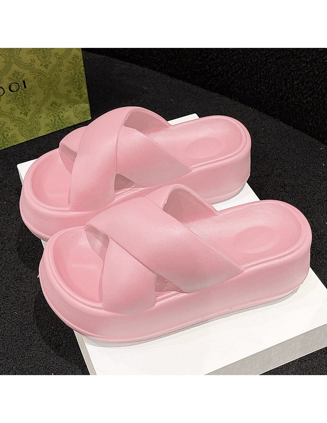 El diseño presenta tiras anchas cruzadas en la parte superior, brindando un soporte seguro al pie. La plataforma es gruesa, ofreciendo altura y comodidad adicional. El material parece ser de un tipo de goma o espuma, lo que sugiere que son sandalias ligeras y posiblemente muy cómodas para uso casual o diario. |