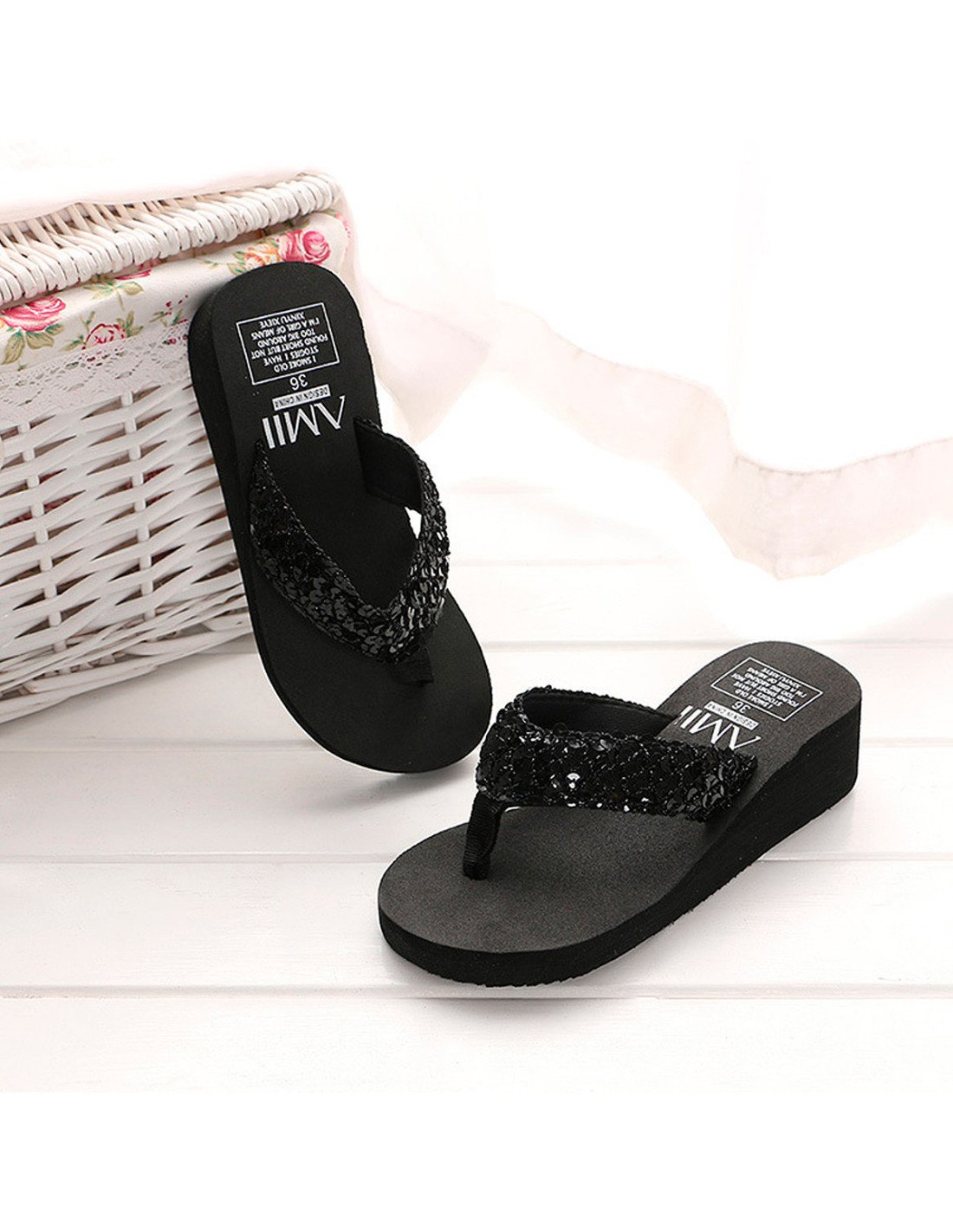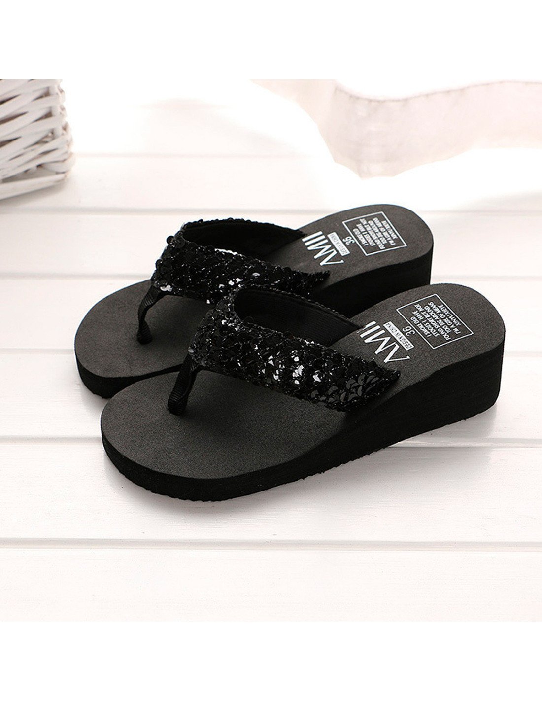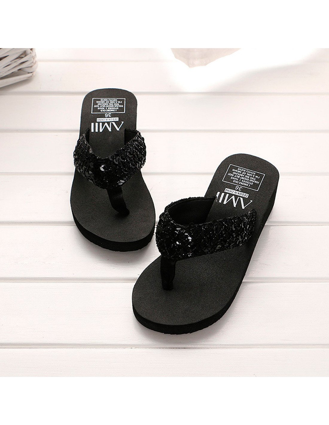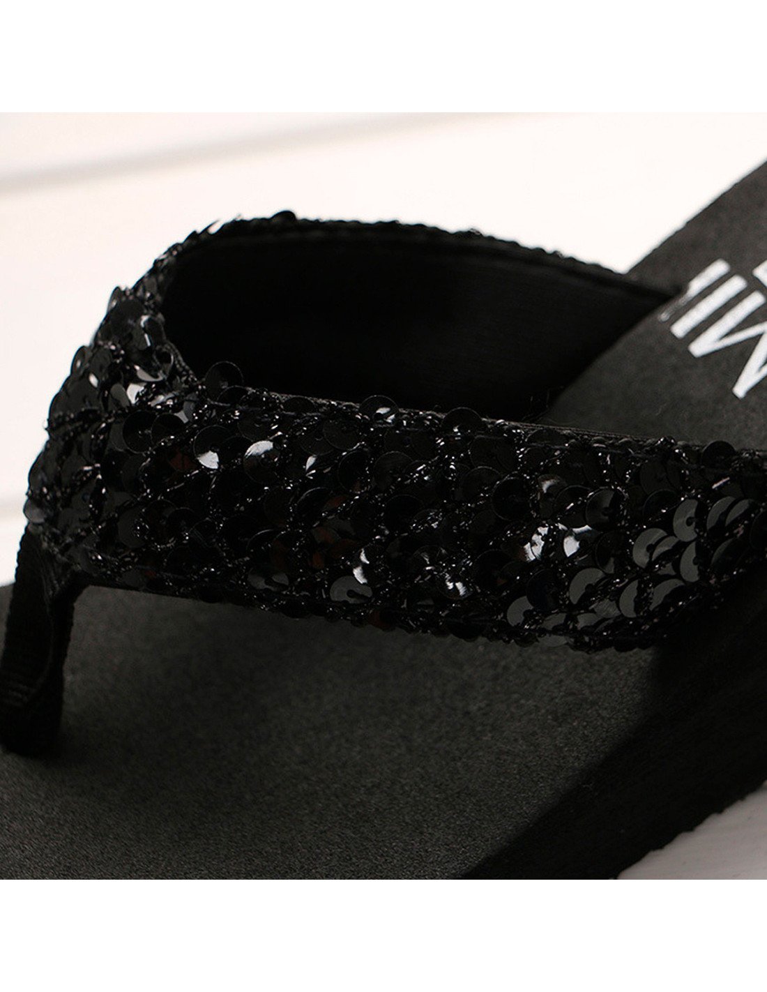 Las correas de las sandalias están adornadas con lentejuelas negras, lo que les confiere un aspecto brillante y elegante. La suela es gruesa, proporcionando tanto altura como comodidad adicional. Altura de plataforma 4.5 cm. |