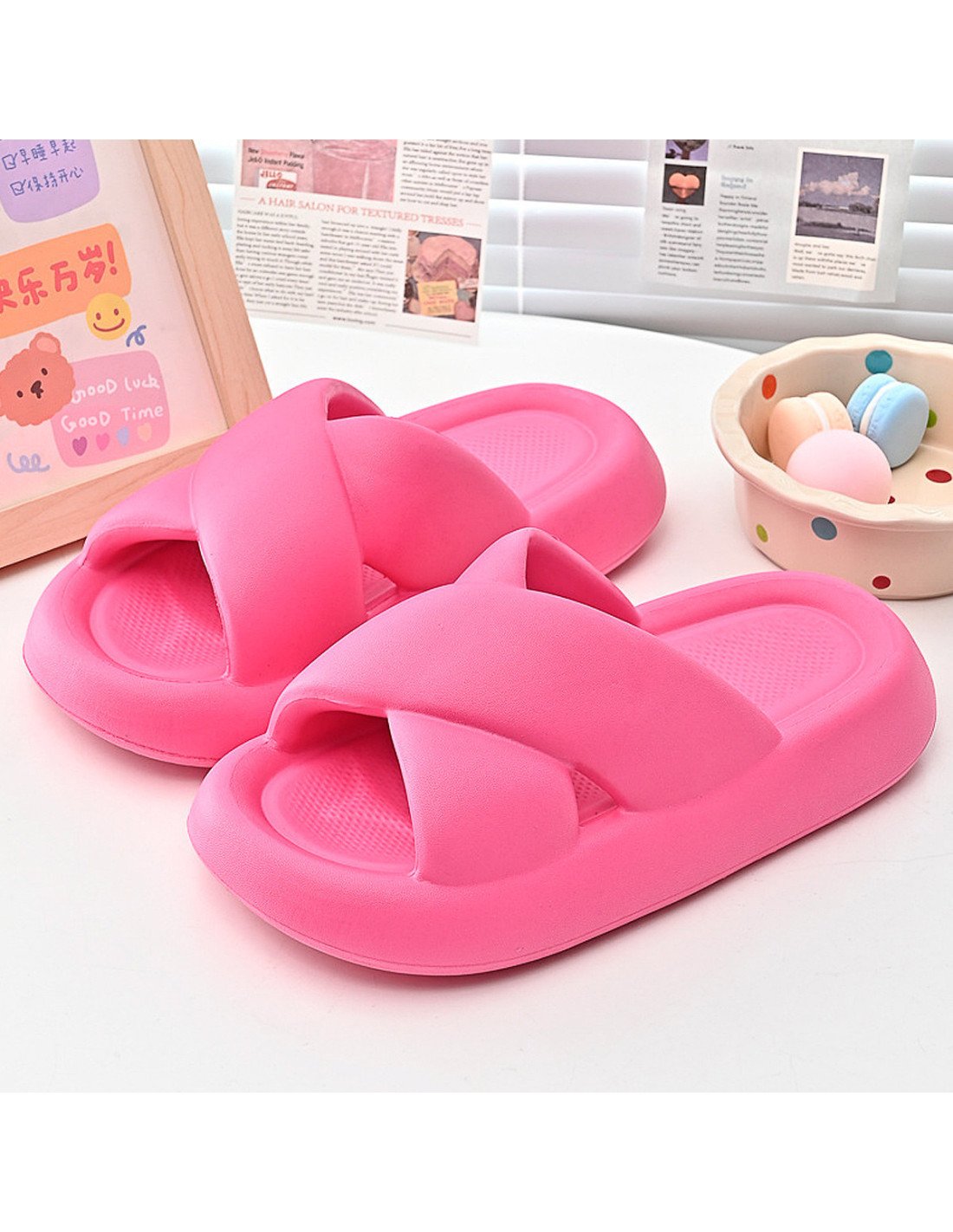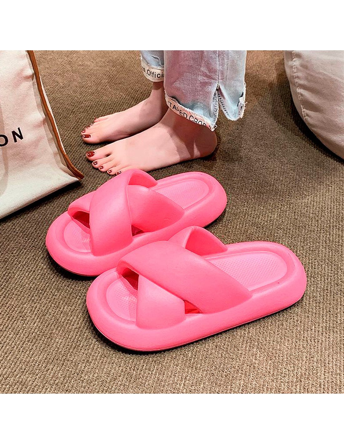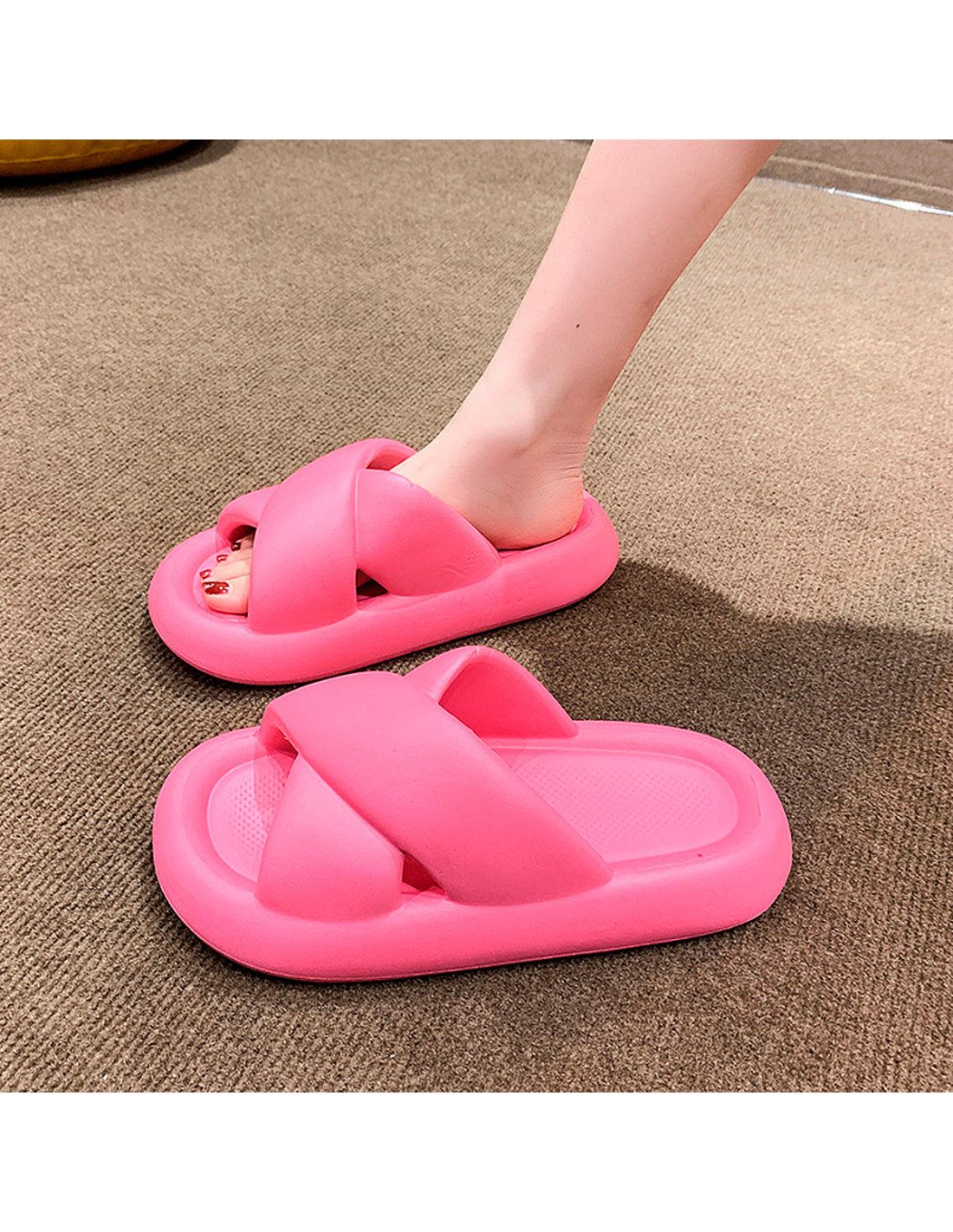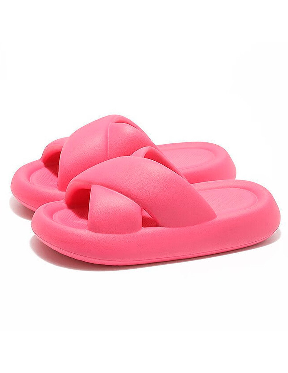 El diseño presenta tiras anchas cruzadas en la parte superior, brindando un soporte seguro al pie. La plataforma es gruesa, ofreciendo altura y comodidad adicional. El material parece ser de un tipo de goma o espuma, lo que sugiere que son sandalias ligeras y posiblemente muy cómodas para uso casual o diario. |