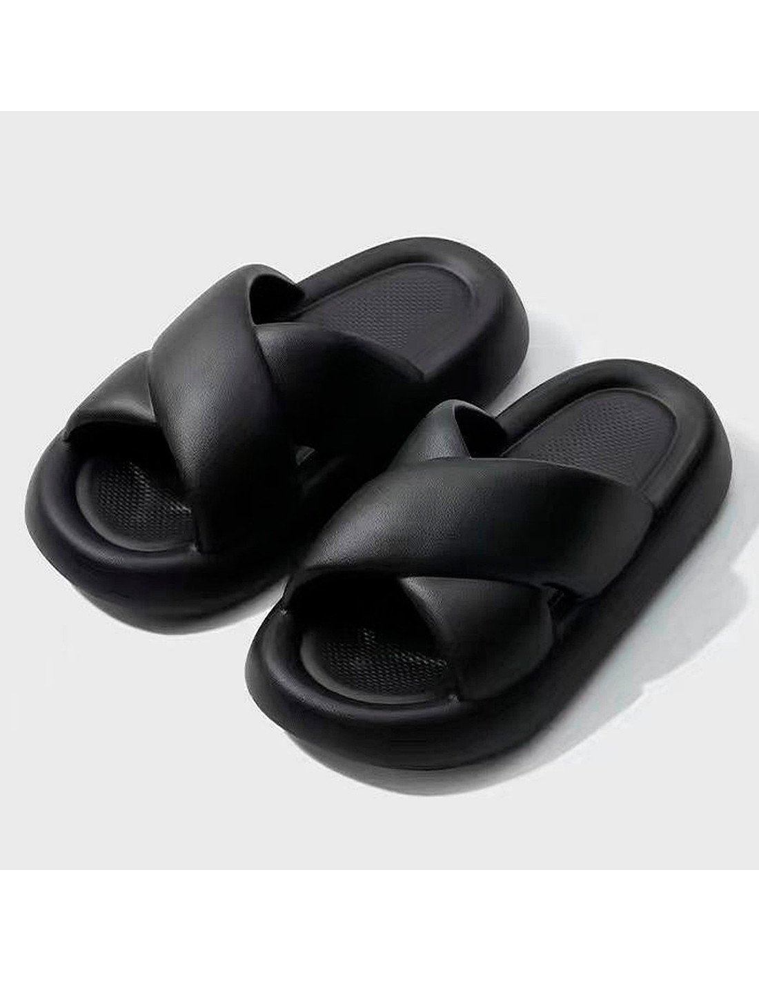 El diseño presenta tiras anchas cruzadas en la parte superior, brindando un soporte seguro al pie. La plataforma es gruesa, ofreciendo altura y comodidad adicional. El material parece ser de un tipo de goma o espuma, lo que sugiere que son sandalias ligeras y posiblemente muy cómodas para uso casual o diario. |