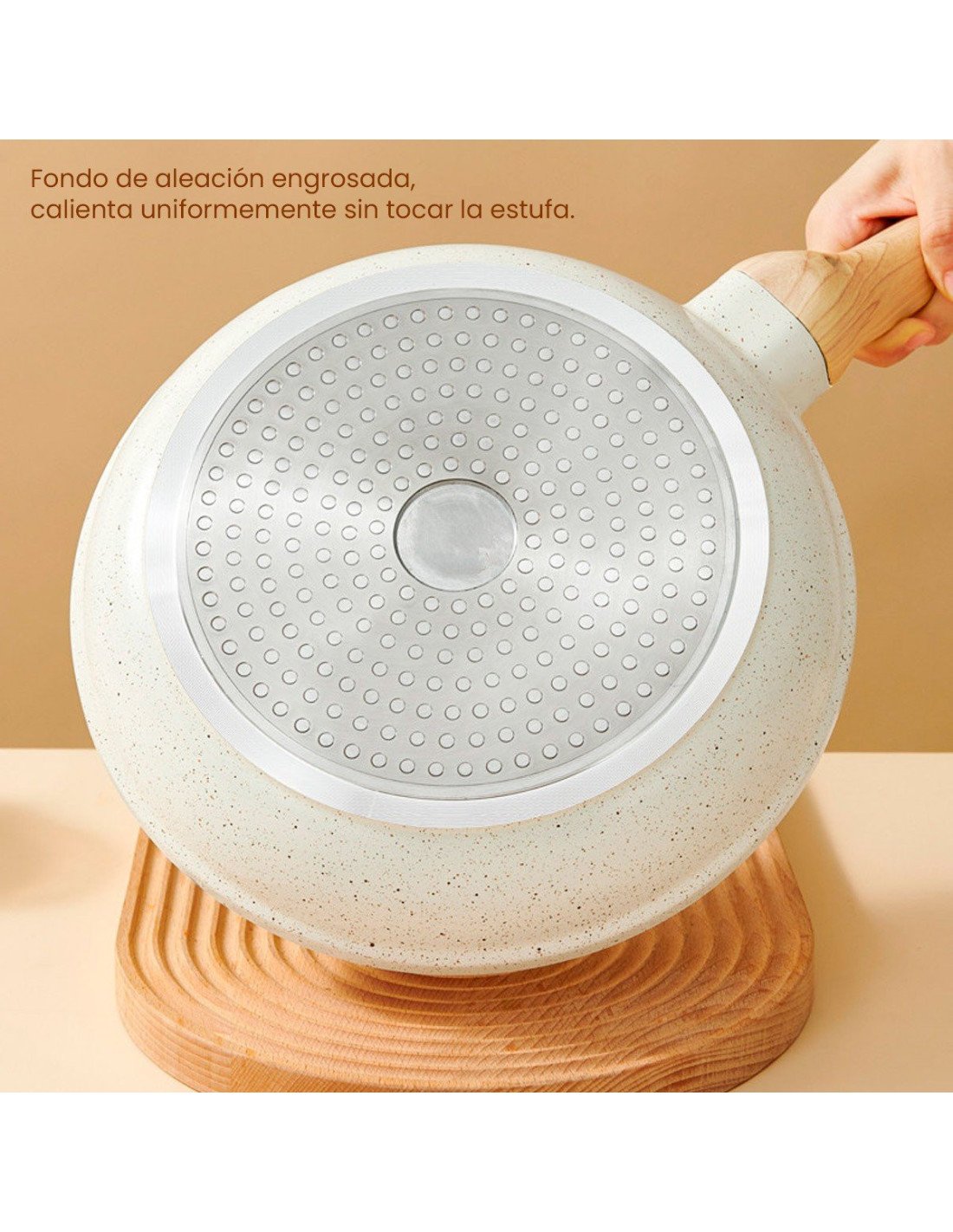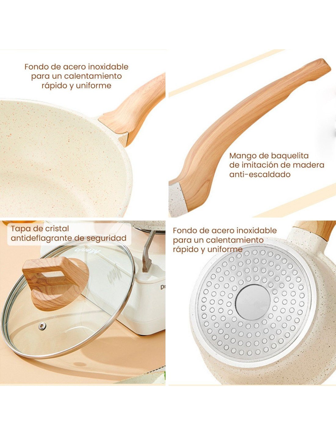 Nuestro sartén con revestimiento de granito de primera calidad ofrece durabilidad y antiadherencia excepcional. Compatible con todos los fogones, su mango de baquelita resistente al calor y núcleo de aluminio garantizan seguridad y calentamiento uniforme. ¡Disponible ahora aqui en LHESH!