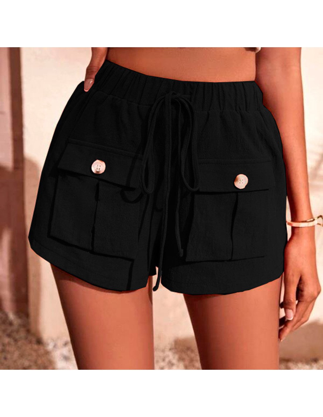 Descubre la combinación perfecta de estilo y comodidad con estos shorts negro para mujer. Confeccionados en un tejido suave y transpirable, estos shorts ofrecen un ajuste relajado ideal para los días cálidos. El diseño de cintura elástica con cordón ajustable garantiza un ajuste personalizado, mientras que los bolsillos delanteros añaden un toque práctico y moderno. Perfectos para cualquier ocasión casual, estos shorts se convertirán en un esencial de tu guardarropa. Disponibles en varias tallas para adaptarse a todas las siluetas.