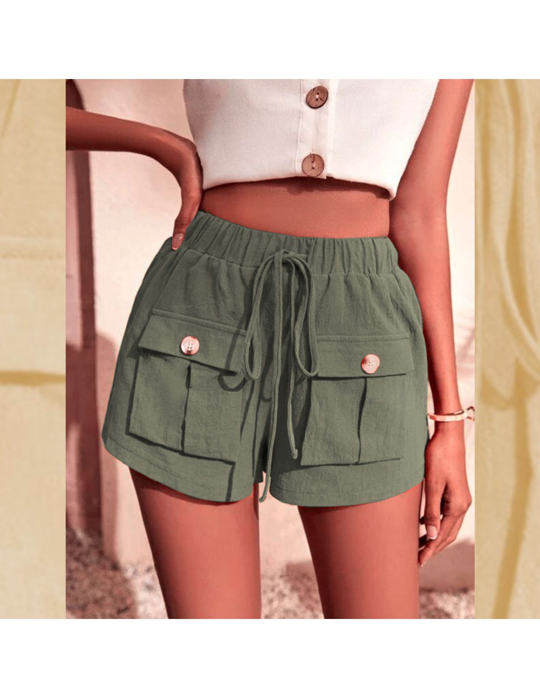 Estos shorts para dama son una prenda versátil y cómoda, perfecta para los días cálidos. Con un diseño de cintura elástica ajustable mediante un cordón, ofrecen un ajuste personalizado y cómodo. Los detalles incluyen dos bolsillos frontales con solapas y botones decorativos, que añaden un toque funcional y de estilo. Fabricados con un tejido ligero y transpirable, estos shorts son ideales para un look casual y relajado, combinándolos con camisetas o blusas frescas para un estilo veraniego. |