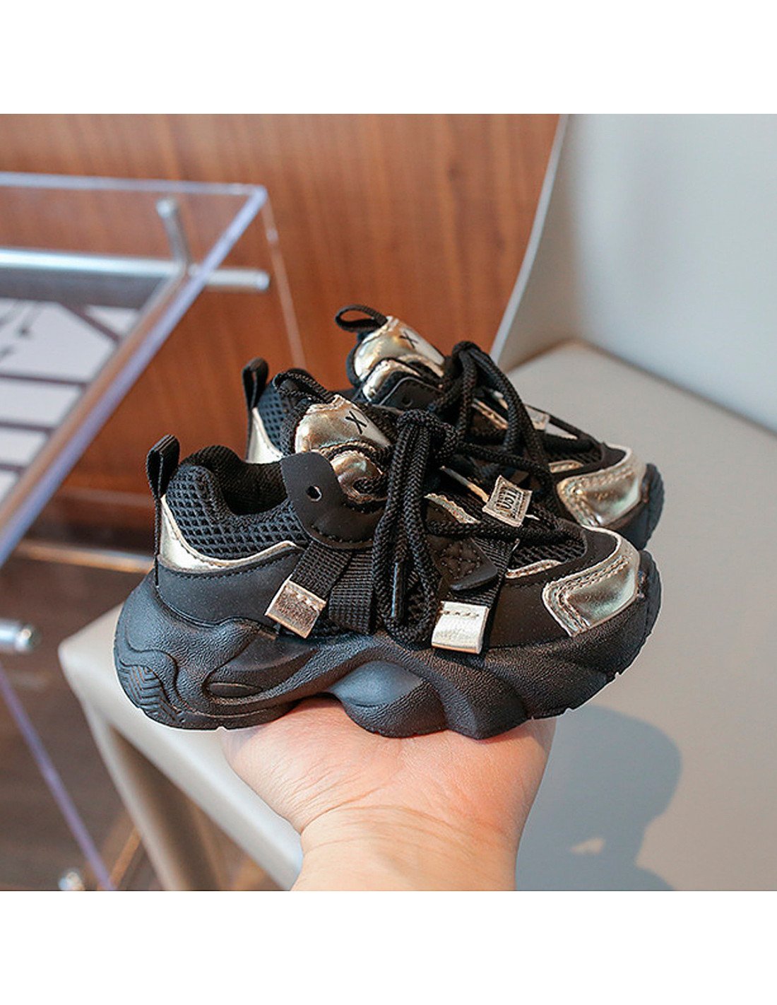 Tenis deportivos con un diseño robusto y moderno, con suelas gruesas y texturizadas que proporcionan buena tracción y soporte. Presentan cordones gruesos y elásticos en color blanco, así como cierres de velcro para un ajuste seguro y fácil de poner y quitar. Los detalles adicionales, como las correas decorativas y los refuerzos en diferentes partes del zapato, añaden un toque estilizado y llamativo, ideal para los niños. |