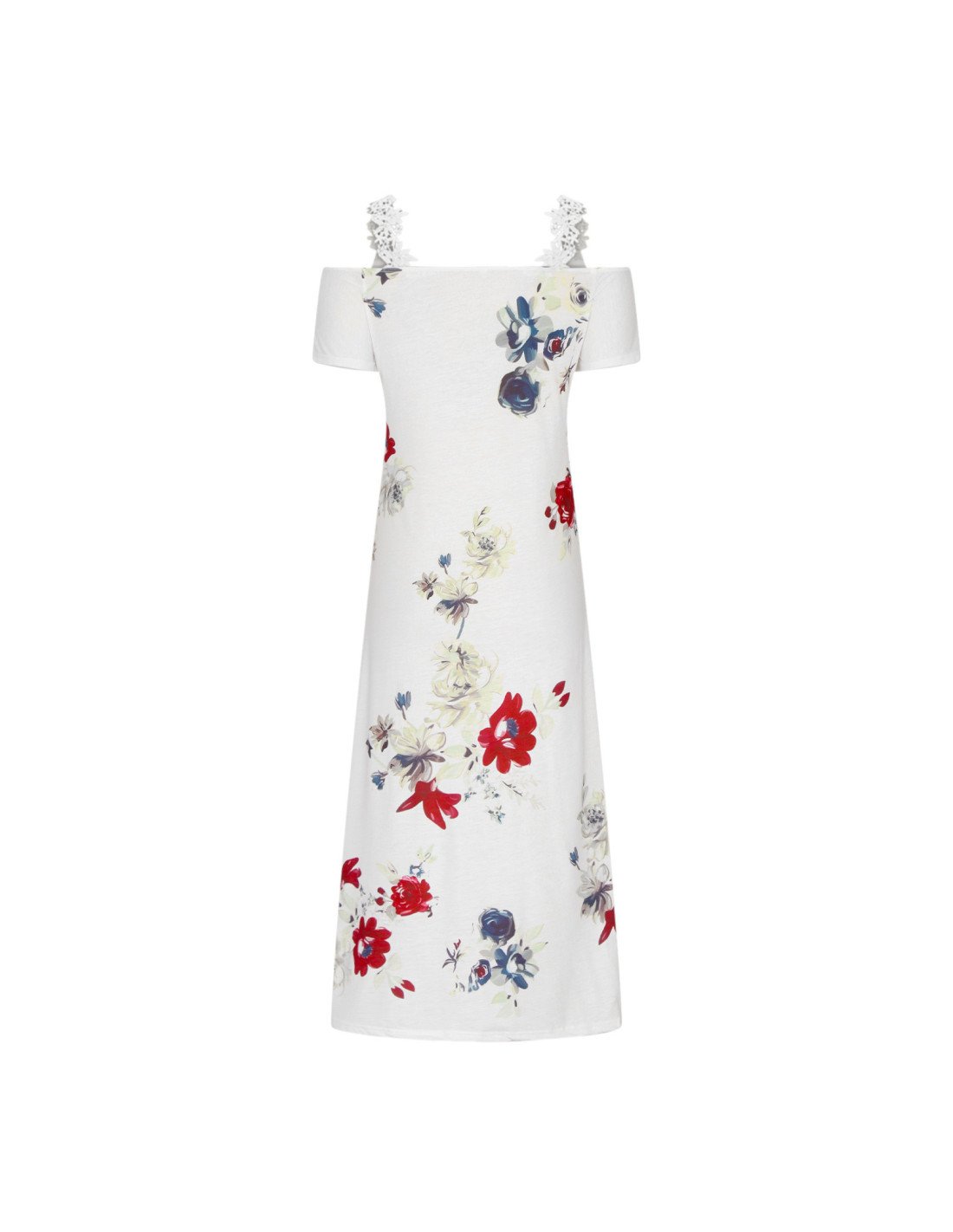 Sumérgete en el verano con estilo en nuestro hermoso vestido largo. Con un encantador estampado floral y detalles de encaje, este vestido de hombros descubiertos es la elección perfecta para lucir casual y elegante en la playa.