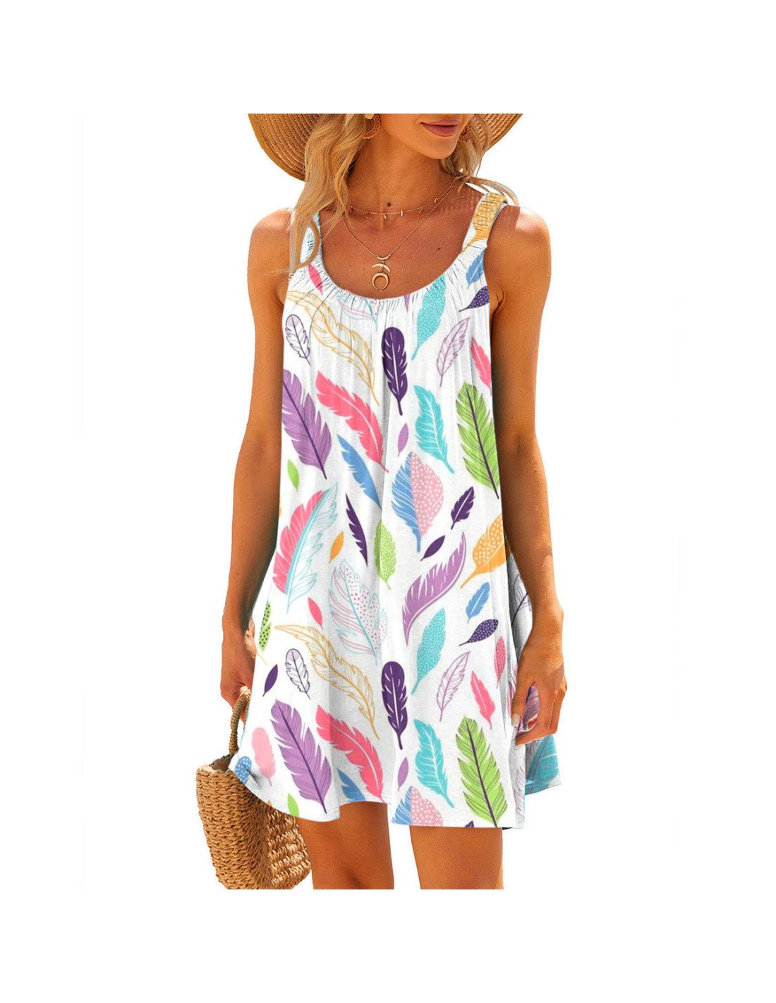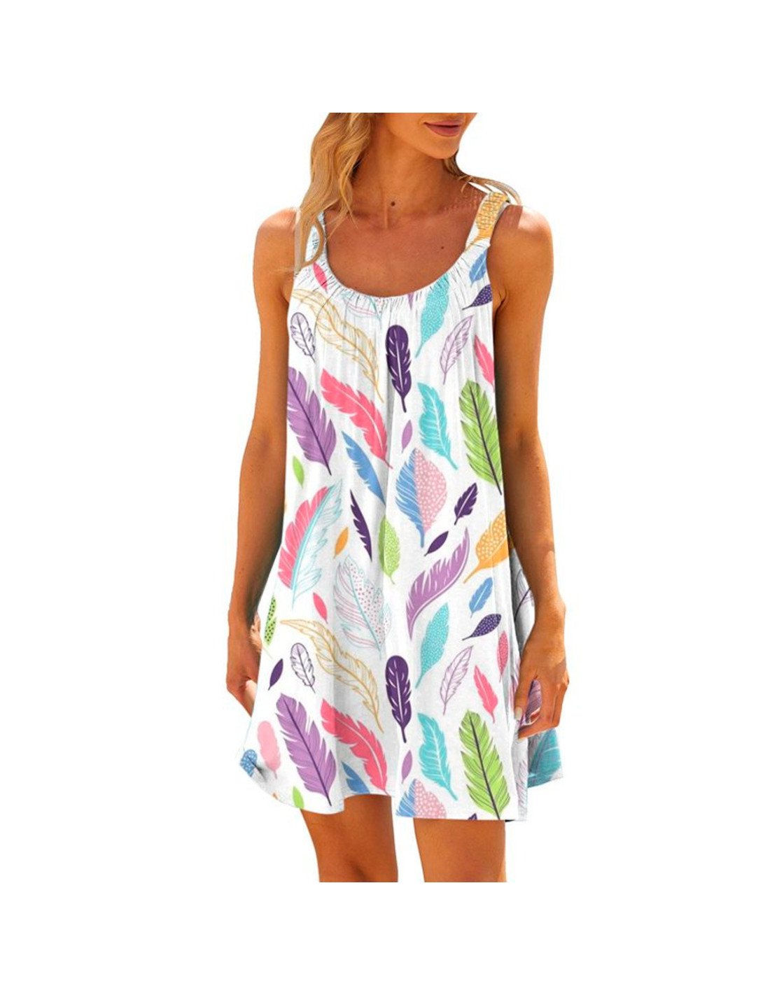 Vestido de verano para mujer, adornado con un vibrante estampado de plumas multicolor. Confeccionado en un tejido suave y transpirable, este vestido ofrece un ajuste relajado ideal para los días cálidos. El diseño sin mangas y el escote redondeado proporcionan frescura y libertad de movimiento, mientras que el corte holgado asegura un look desenfadado y chic. Perfecto para cualquier ocasión casual, desde un día en la playa hasta un paseo por la ciudad, este vestido se convertirá en un esencial de tu guardarropa. Disponibles en varias tallas para adaptarse a todas las siluetas |