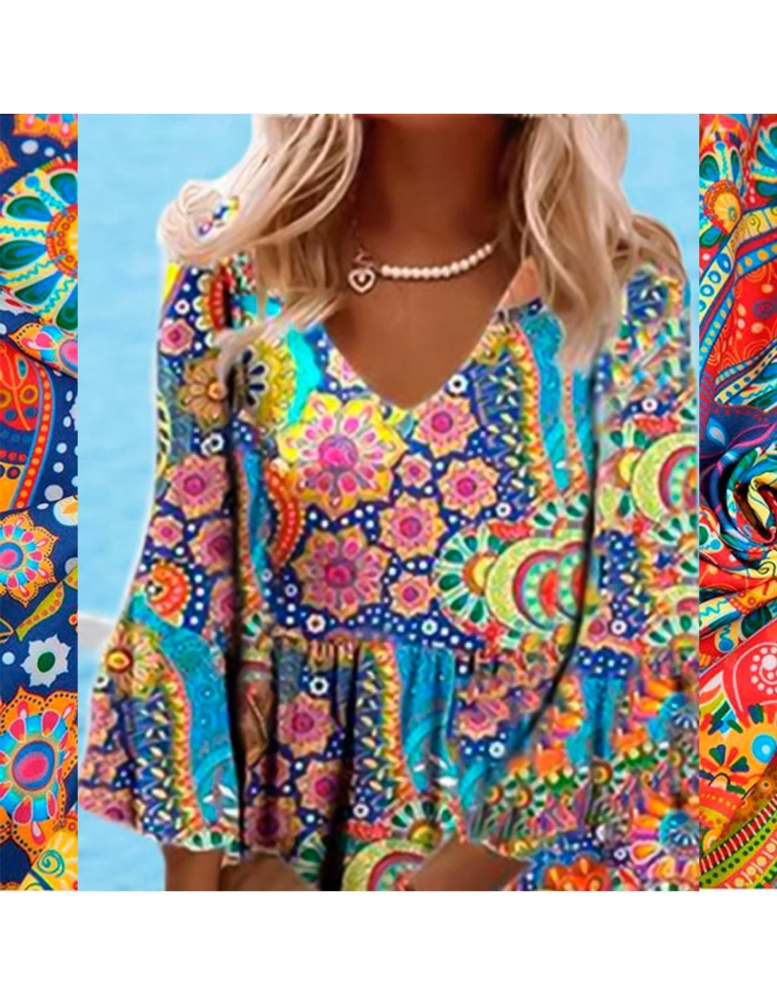 Vestido de verano cuello en V con estampado étnico y colores vibrantes para dama |